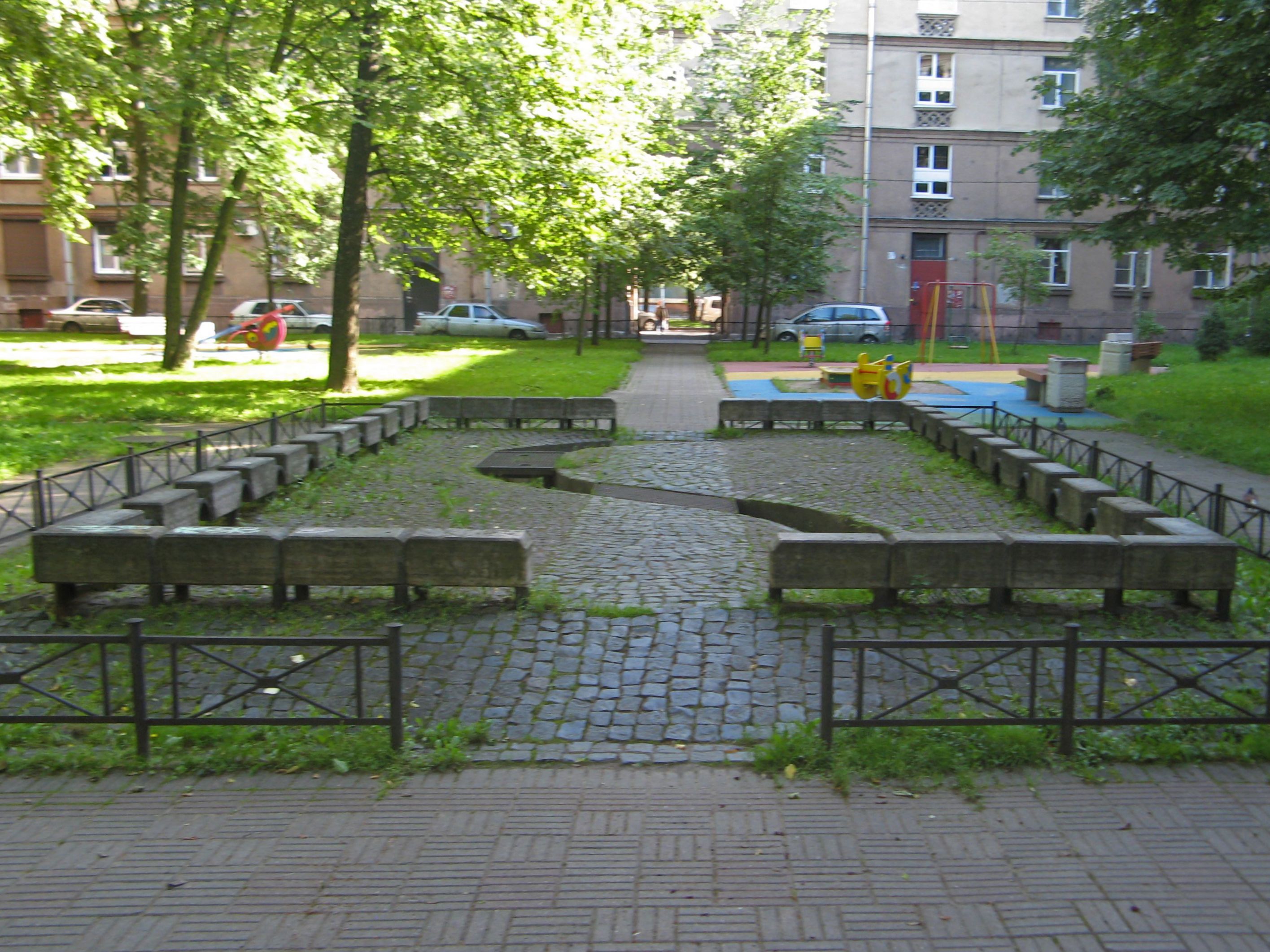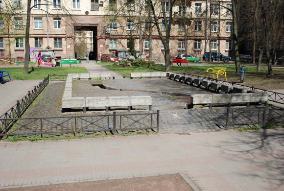 Пешеходный фонтан во дворе дома на пересечении ул. Ленсовета 10 и улицы Гастелло 26. Ожидает восстановления.